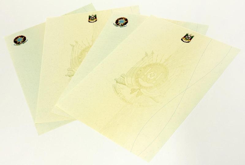 3) Guiloche ou Rosáceas: Motivos delicados de aspecto floral, composto por linhas contínuas entrelaçadas dispostas em figuras geométricas. Formam padrões complexos de difícil reprodução manual ou através de reprografia. Perde definição quando o documento é copiado. Tinta Invisível Fluorescente: Os detalhes impressos nessa tinta são invisíveis ao olho nu, porém quando são expostos a uma lâmpada que emite radiação U.V. (ultravioleta) aparecem fluorescentes. Esse item é muito importante para combater a fraude.